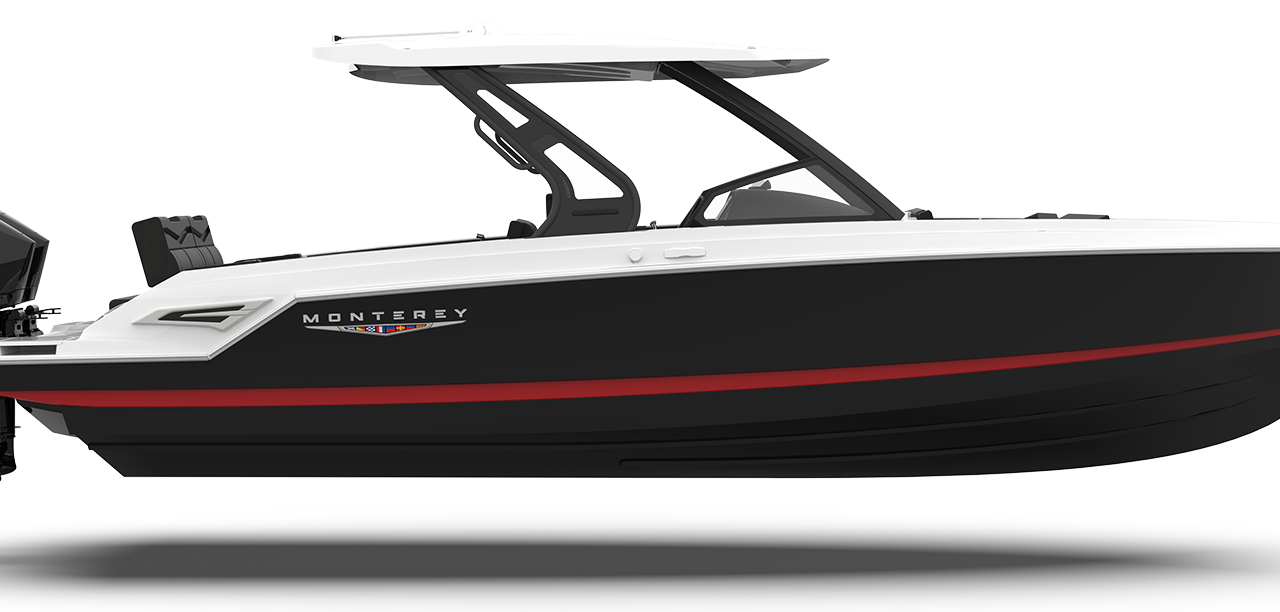 BRAND NEW MONTEREY 27 ELITE I/O MEDITERRANEAN BLUE & RIO RED EXTERIOR DUNE FLOORING & SEATING Stern Drive Bravo 3...